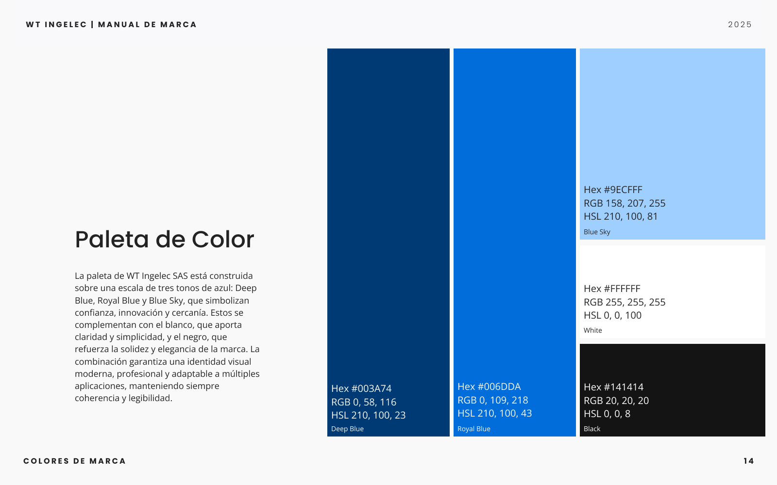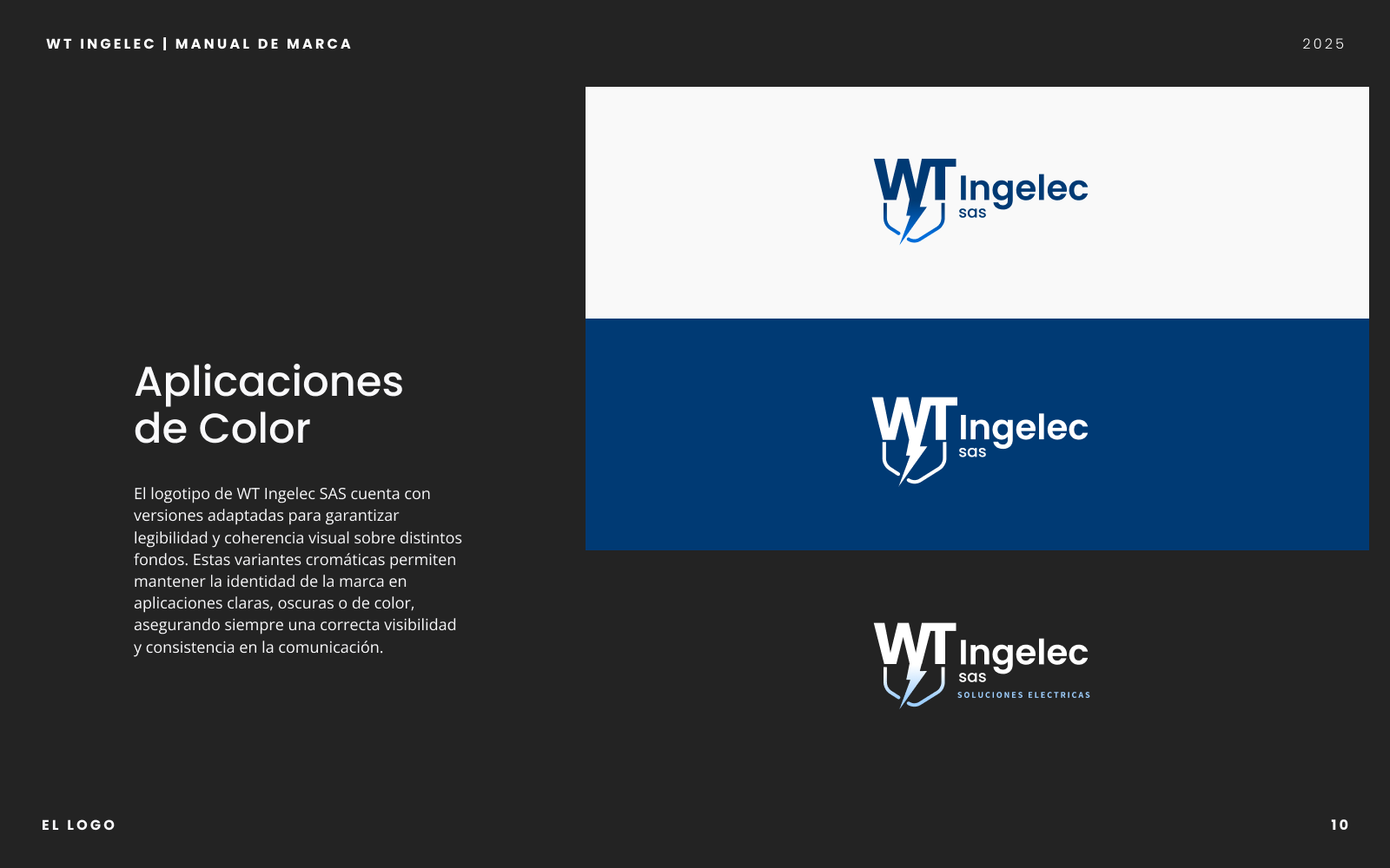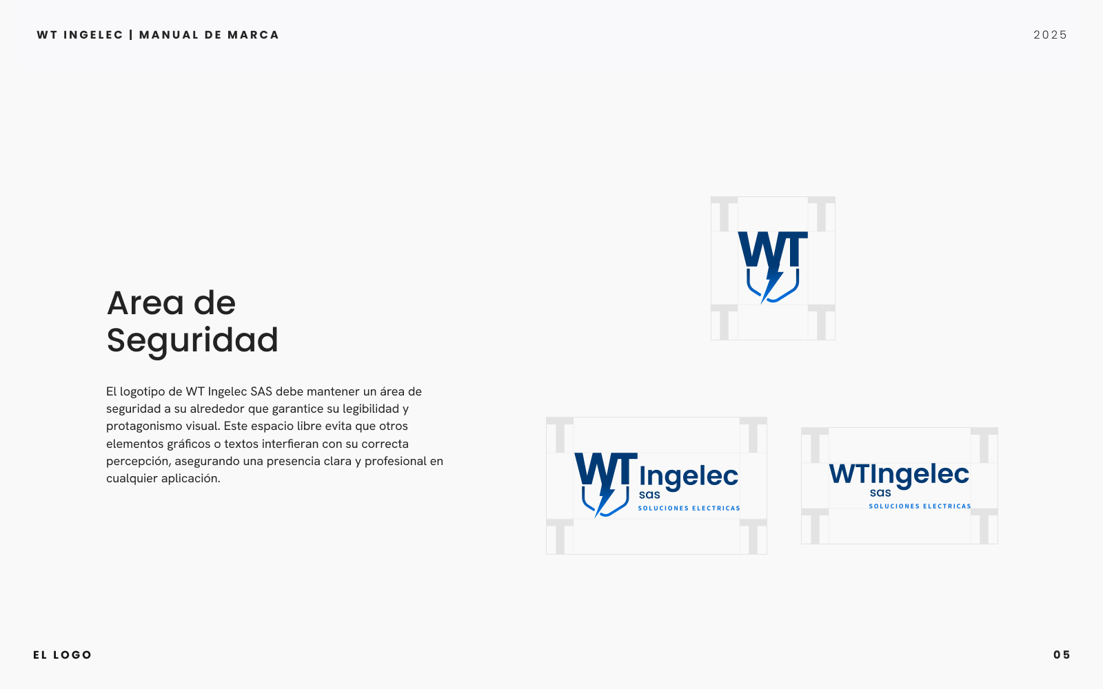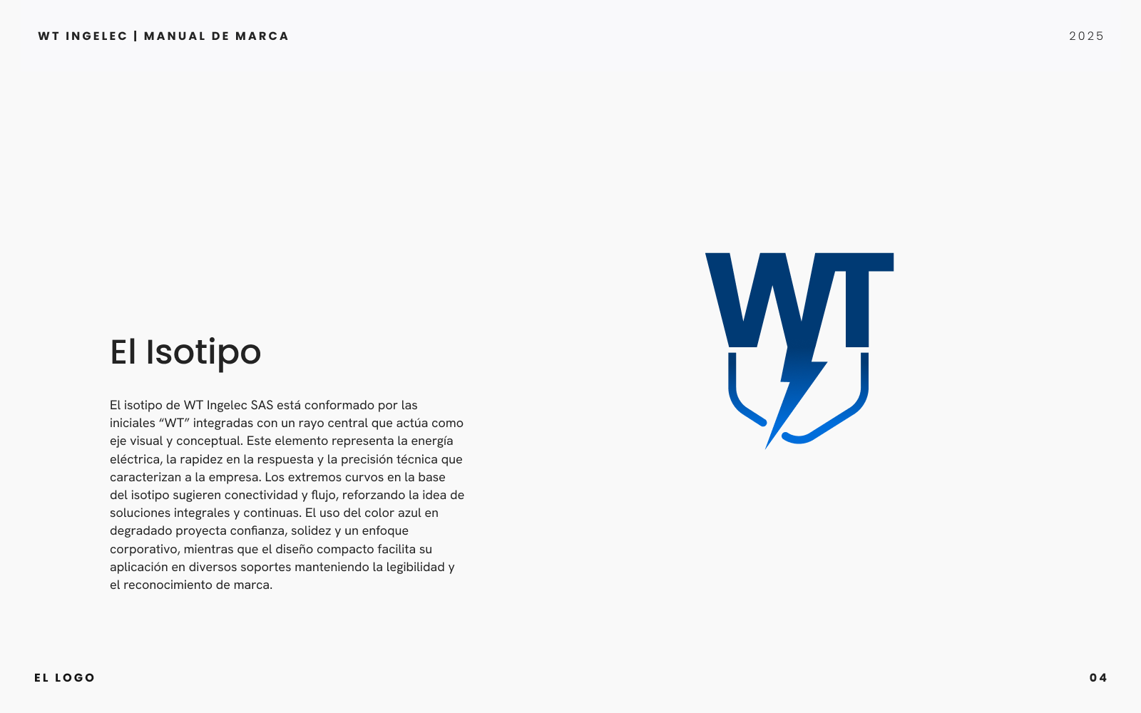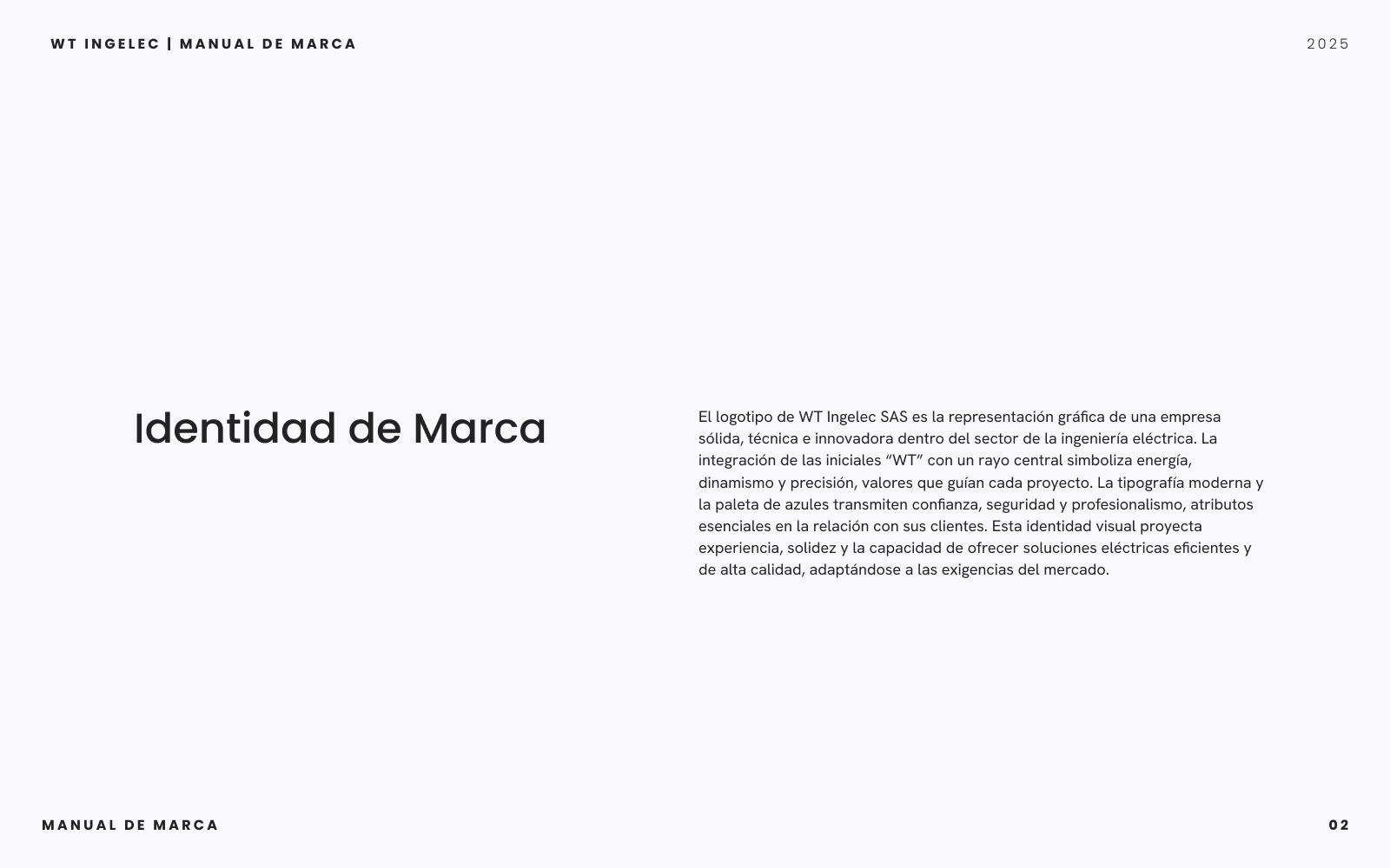 Proyecto integral que incluyó el diseño del manual de marca y la creación de la página web corporativa de WT Ingelec SAS. Definí la paleta cromática, sistema tipográfico y lineamientos de uso del logotipo para consolidar una identidad visual moderna y coherente. En paralelo, desarrollé el sitio web utilizando