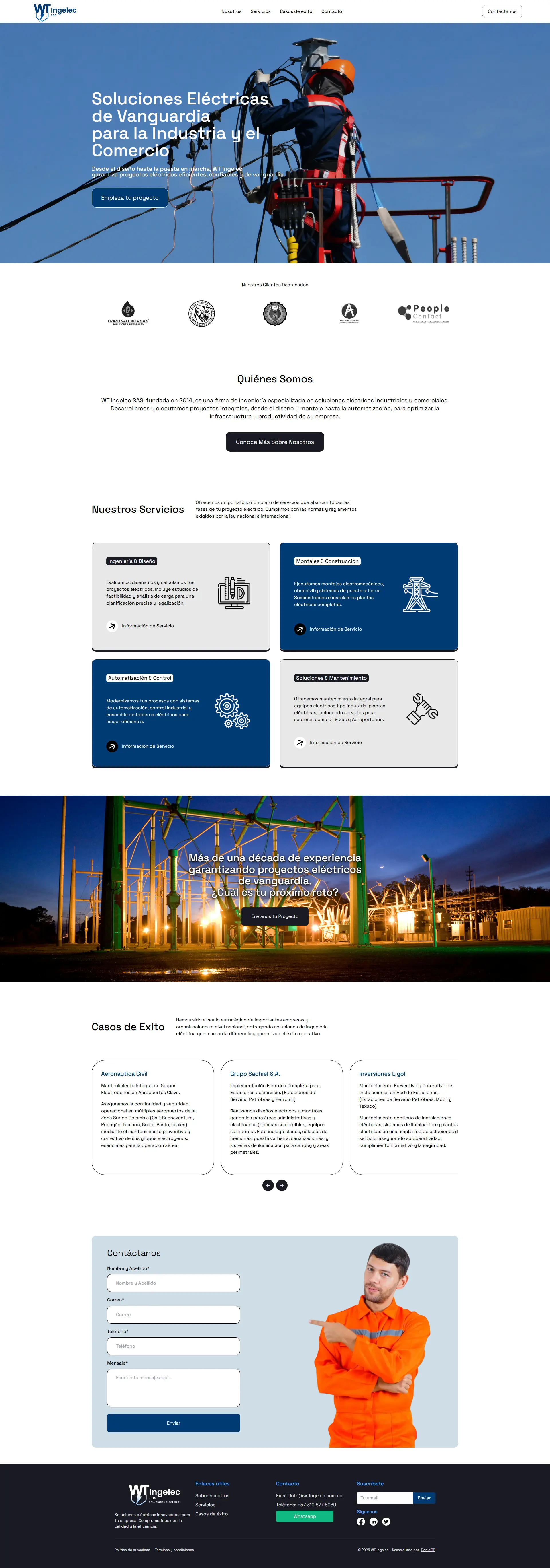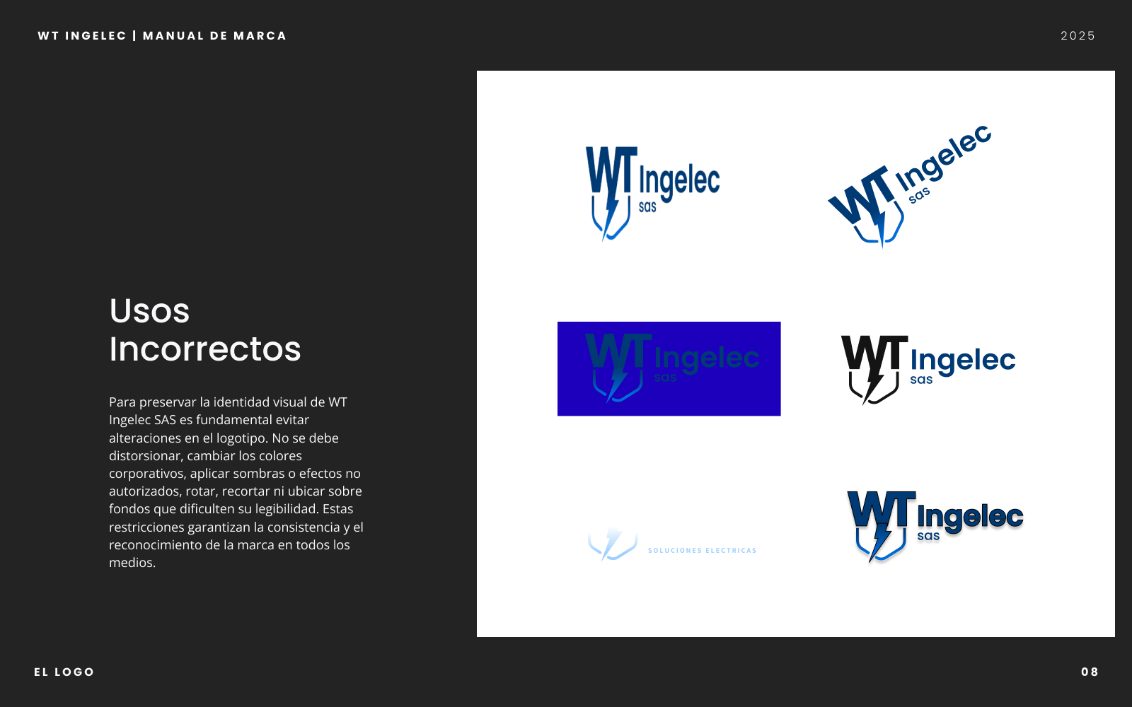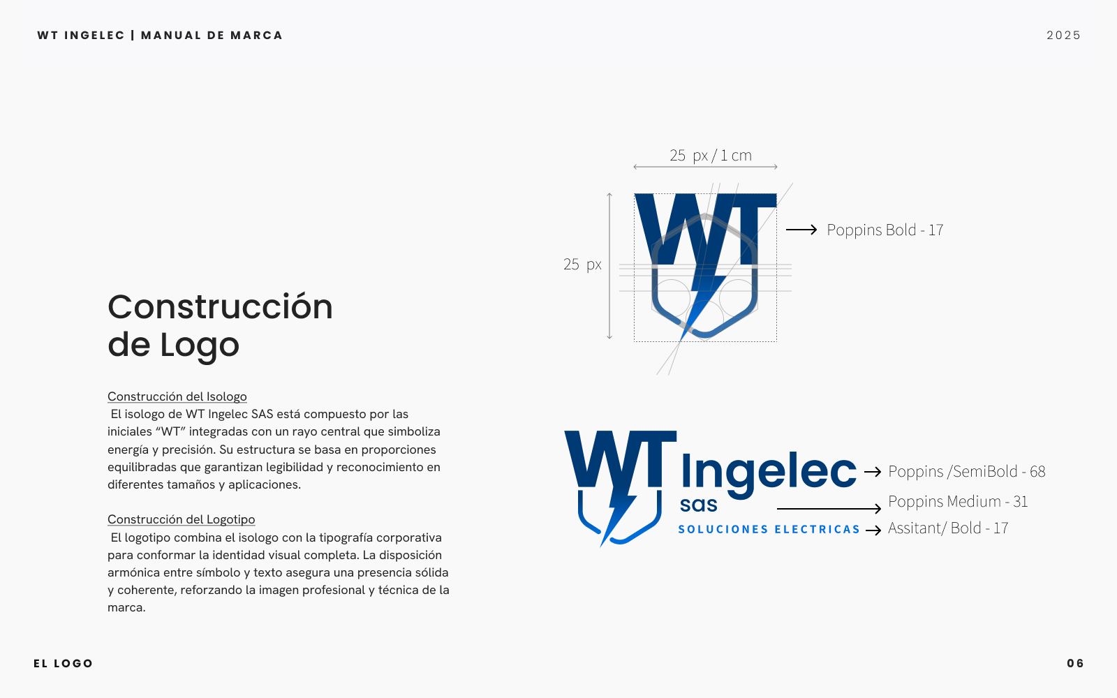 Proyecto integral que incluyó el diseño del manual de marca y la creación de la página web corporativa de WT Ingelec SAS. Definí la paleta cromática, sistema tipográfico y lineamientos de uso del logotipo para consolidar una identidad visual moderna y coherente. En paralelo, desarrollé el sitio web utilizando