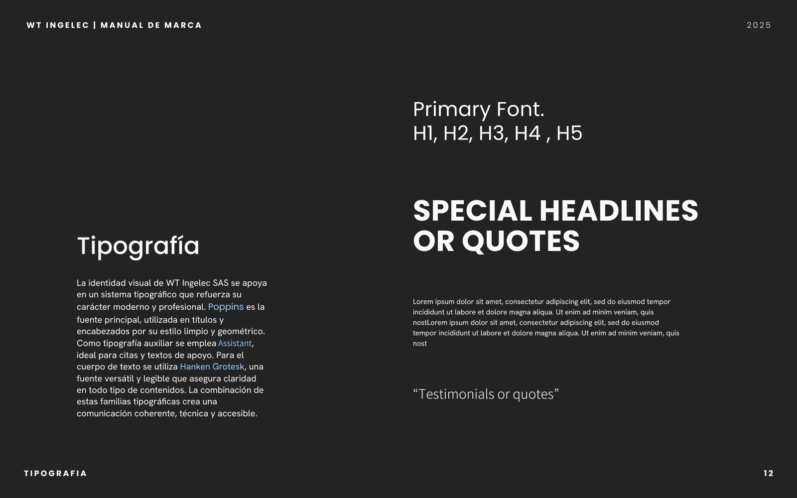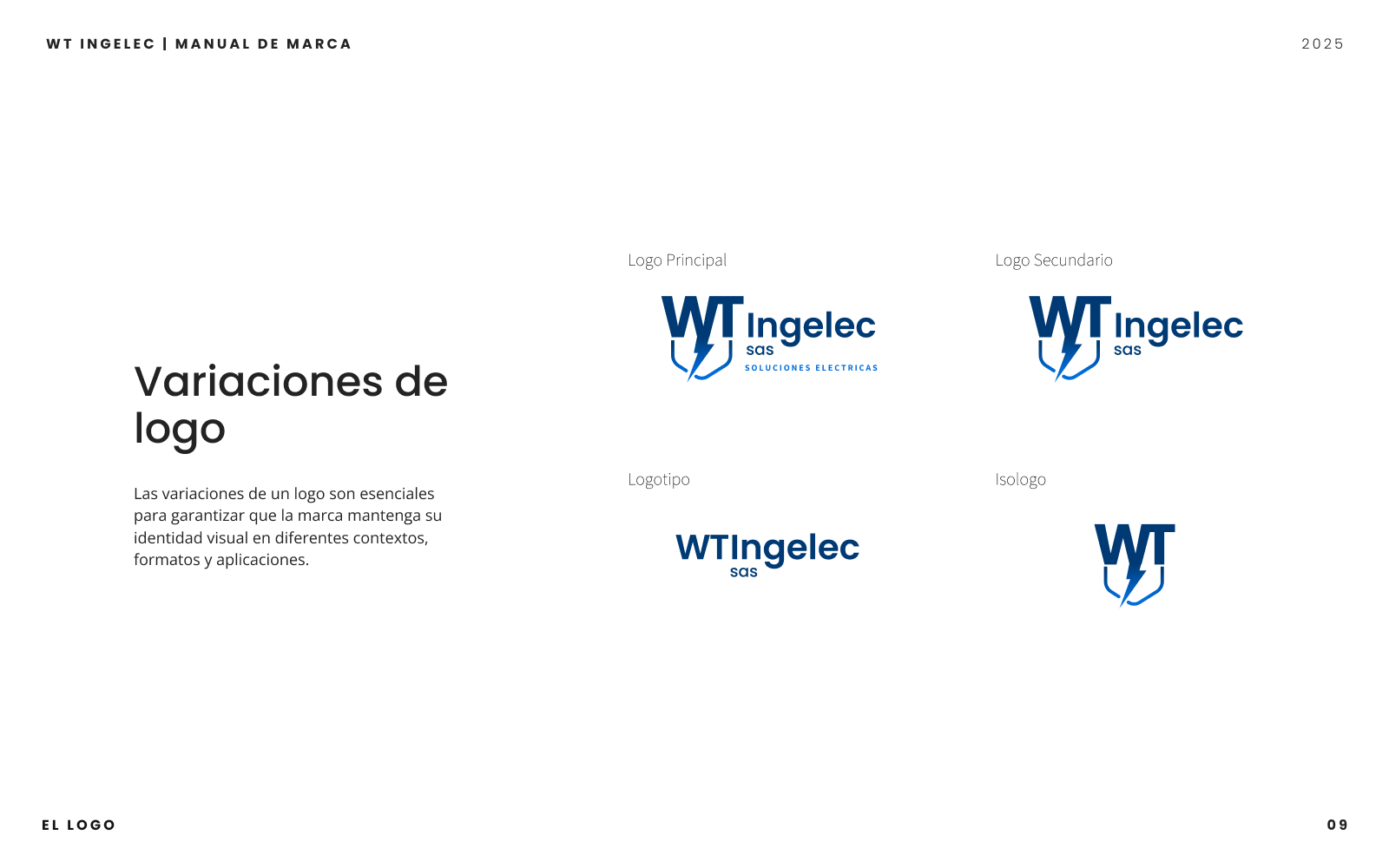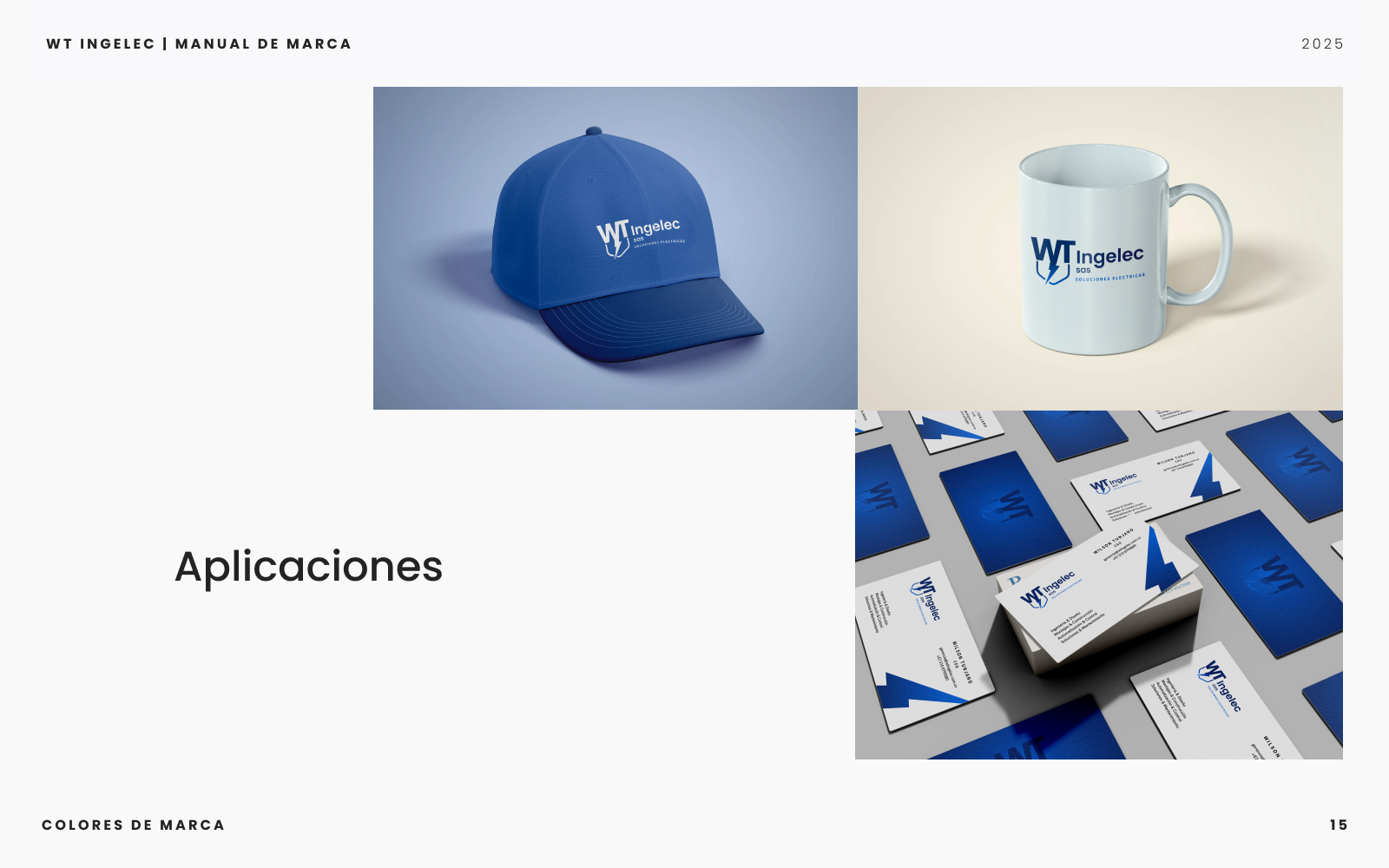 Proyecto integral que incluyó el diseño del manual de marca y la creación de la página web corporativa de WT Ingelec SAS. Definí la paleta cromática, sistema tipográfico y lineamientos de uso del logotipo para consolidar una identidad visual moderna y coherente. En paralelo, desarrollé el sitio web utilizando